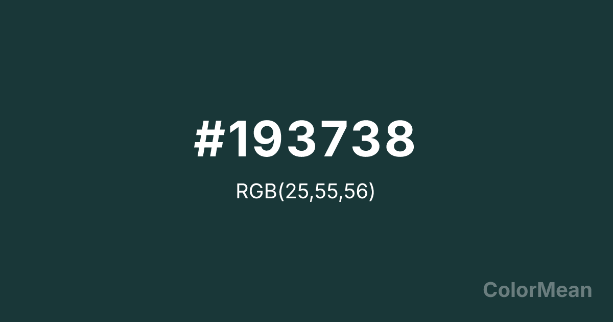 #193738 RGB value is (25, 55, 56). The hex color red value is 25, green is 55, and blue is 56. Its HSL format shows a hue of 182°, saturation of 38 percent, and lightness of 16 percent. The CMYK process values are 55 percent, 2 percent, 0 percent, 78 percent.