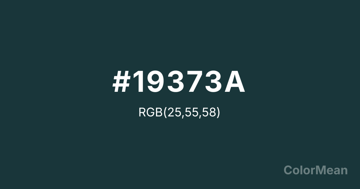 #19373A RGB value is (25, 55, 58). The hex color red value is 25, green is 55, and blue is 58. Its HSL format shows a hue of 185°, saturation of 40 percent, and lightness of 16 percent. The CMYK process values are 57 percent, 5 percent, 0 percent, 77 percent.