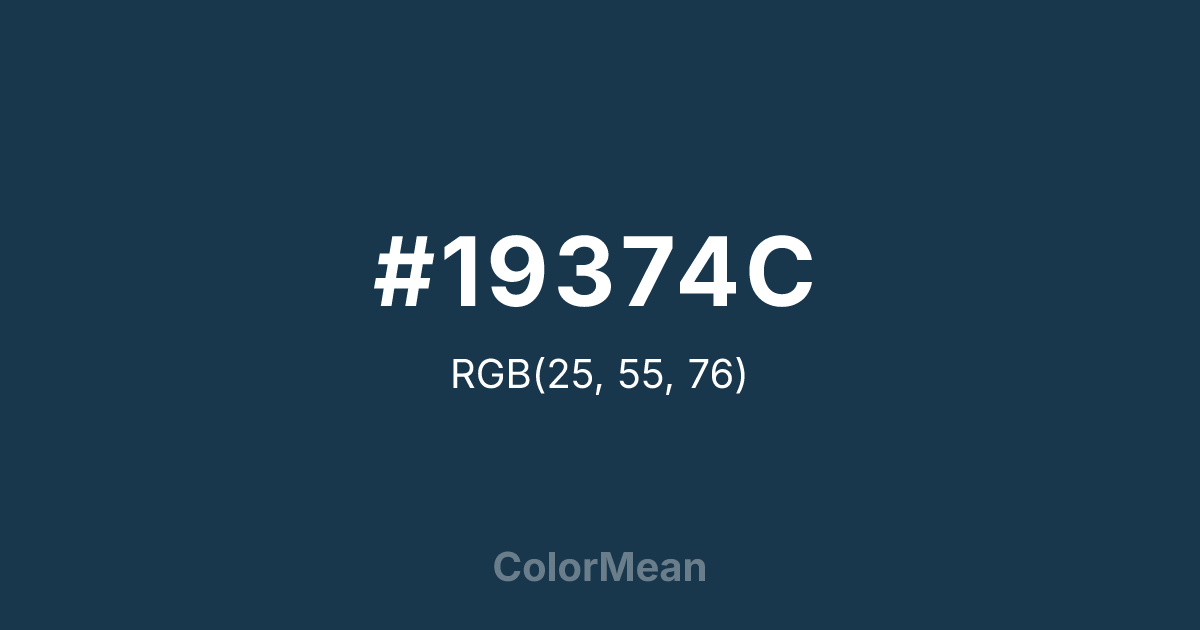 #19374C RGB value is (25, 55, 76). The hex color red value is 25, green is 55, and blue is 76. Its HSL format shows a hue of 205°, saturation of 50 percent, and lightness of 20 percent. The CMYK process values are 67 percent, 28 percent, 0 percent, 70 percent.