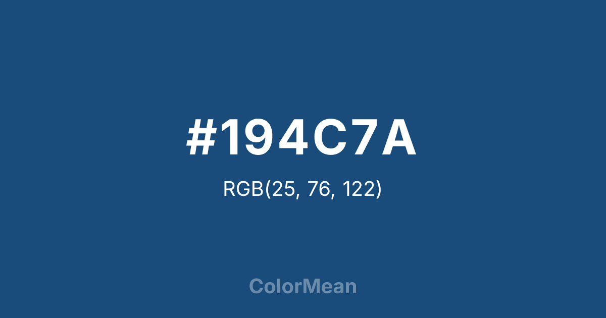 #194C7A RGB value is (25, 76, 122). The hex color red value is 25, green is 76, and blue is 122. Its HSL format shows a hue of 208°, saturation of 66 percent, and lightness of 29 percent. The CMYK process values are 80 percent, 38 percent, 0 percent, 52 percent.