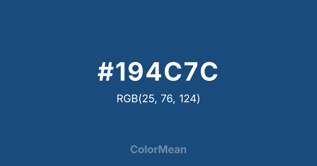 #194C7C RGB value is (25, 76, 124). The hex color red value is 25, green is 76, and blue is 124. Its HSL format shows a hue of 209°, saturation of 66 percent, and lightness of 29 percent. The CMYK process values are 80 percent, 39 percent, 0 percent, 51 percent.