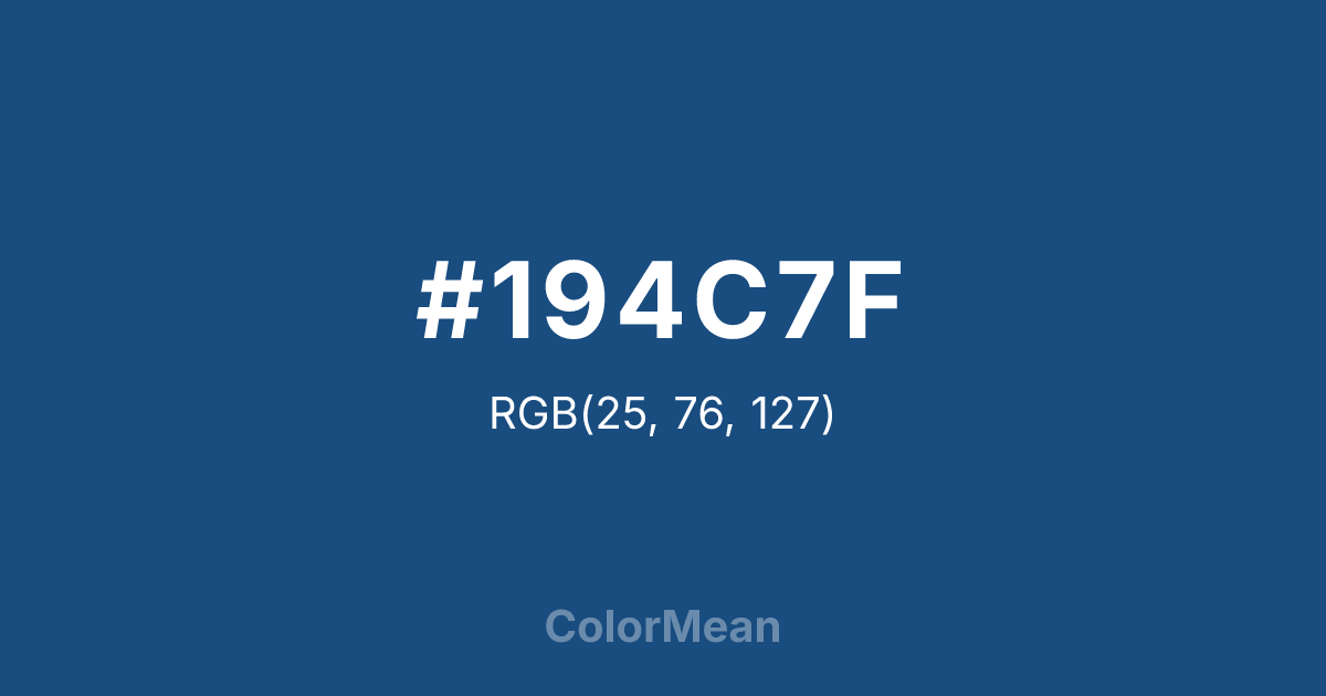 #194C7F RGB value is (25, 76, 127). The hex color red value is 25, green is 76, and blue is 127. Its HSL format shows a hue of 210°, saturation of 67 percent, and lightness of 30 percent. The CMYK process values are 80 percent, 40 percent, 0 percent, 50 percent.