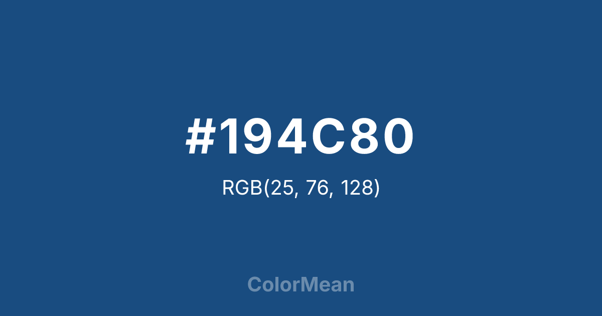 #194C80 RGB value is (25, 76, 128). The hex color red value is 25, green is 76, and blue is 128. Its HSL format shows a hue of 210°, saturation of 67 percent, and lightness of 30 percent. The CMYK process values are 80 percent, 41 percent, 0 percent, 50 percent.