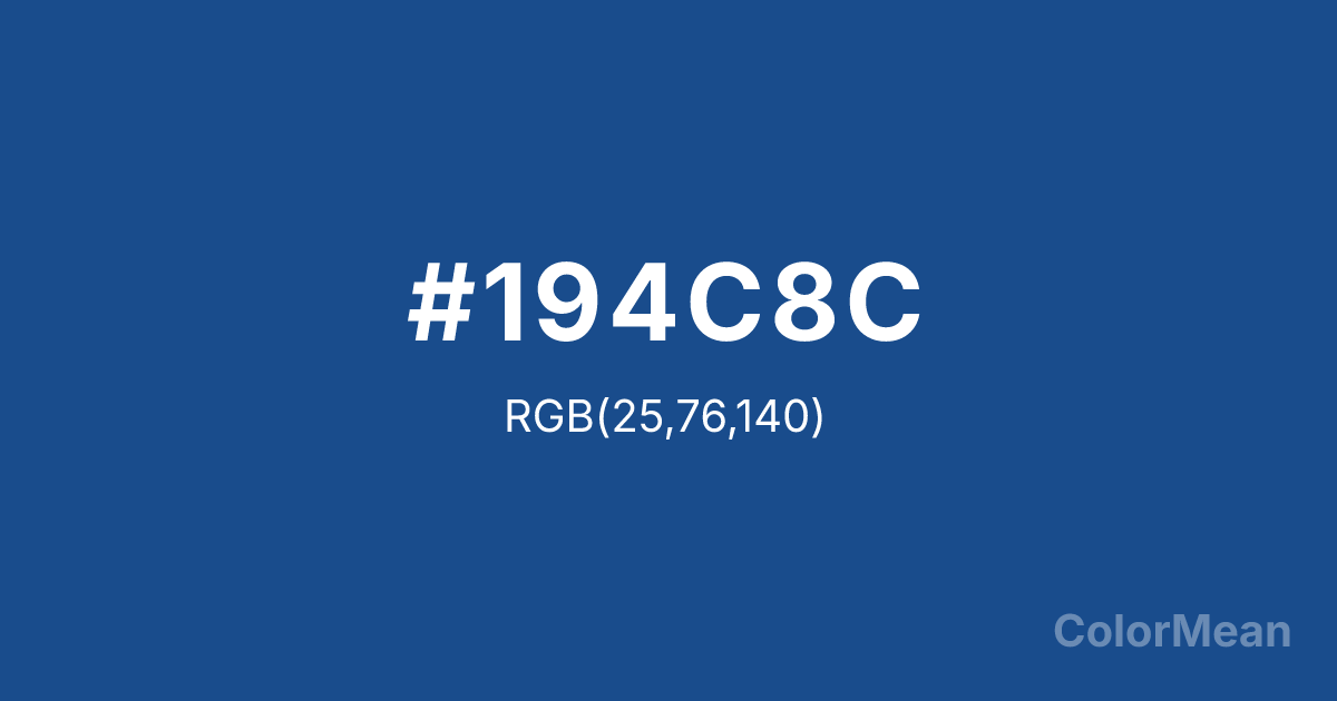 #194C8C RGB value is (25, 76, 140). The hex color red value is 25, green is 76, and blue is 140. Its HSL format shows a hue of 213°, saturation of 70 percent, and lightness of 32 percent. The CMYK process values are 82 percent, 46 percent, 0 percent, 45 percent.