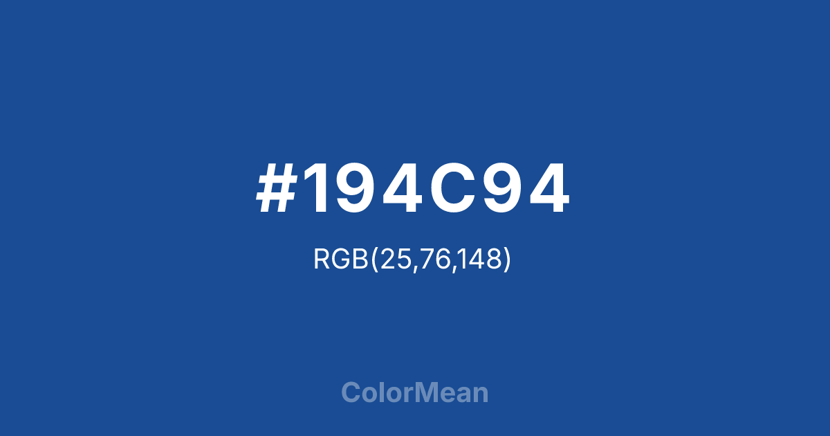 #194C94 RGB value is (25, 76, 148). The hex color red value is 25, green is 76, and blue is 148. Its HSL format shows a hue of 215°, saturation of 71 percent, and lightness of 34 percent. The CMYK process values are 83 percent, 49 percent, 0 percent, 42 percent.