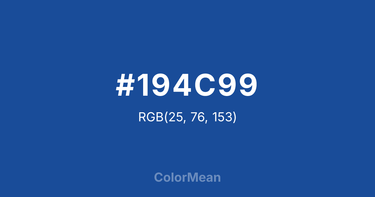 #194C99 RGB value is (25, 76, 153). The hex color red value is 25, green is 76, and blue is 153. Its HSL format shows a hue of 216°, saturation of 72 percent, and lightness of 35 percent. The CMYK process values are 84 percent, 50 percent, 0 percent, 40 percent.