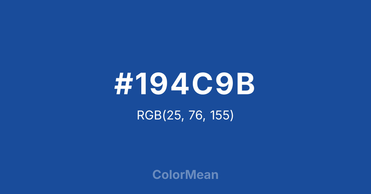 #194C9B RGB value is (25, 76, 155). The hex color red value is 25, green is 76, and blue is 155. Its HSL format shows a hue of 216°, saturation of 72 percent, and lightness of 35 percent. The CMYK process values are 84 percent, 51 percent, 0 percent, 39 percent.