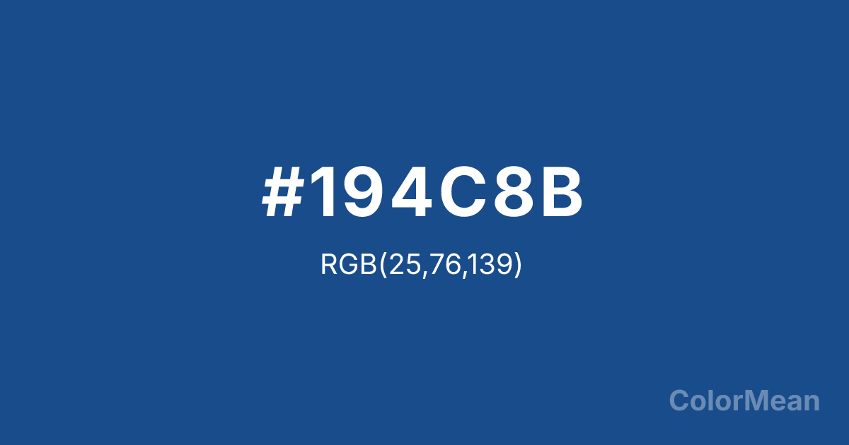 Classic Blue (#194C8B) RGB value is (25, 76, 139). The hex color red value is 25, green is 76, and blue is 139. Its HSL format shows a hue of 213°, saturation of 70 percent, and lightness of 32 percent. The CMYK process values are 82 percent, 45 percent, 0 percent, 45 percent.