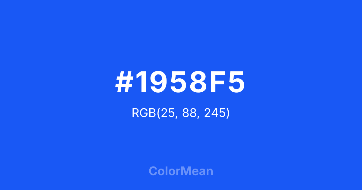 #1958F5 RGB value is (25, 88, 245). The hex color red value is 25, green is 88, and blue is 245. Its HSL format shows a hue of 223°, saturation of 92 percent, and lightness of 53 percent. The CMYK process values are 90 percent, 64 percent, 0 percent, 4 percent.