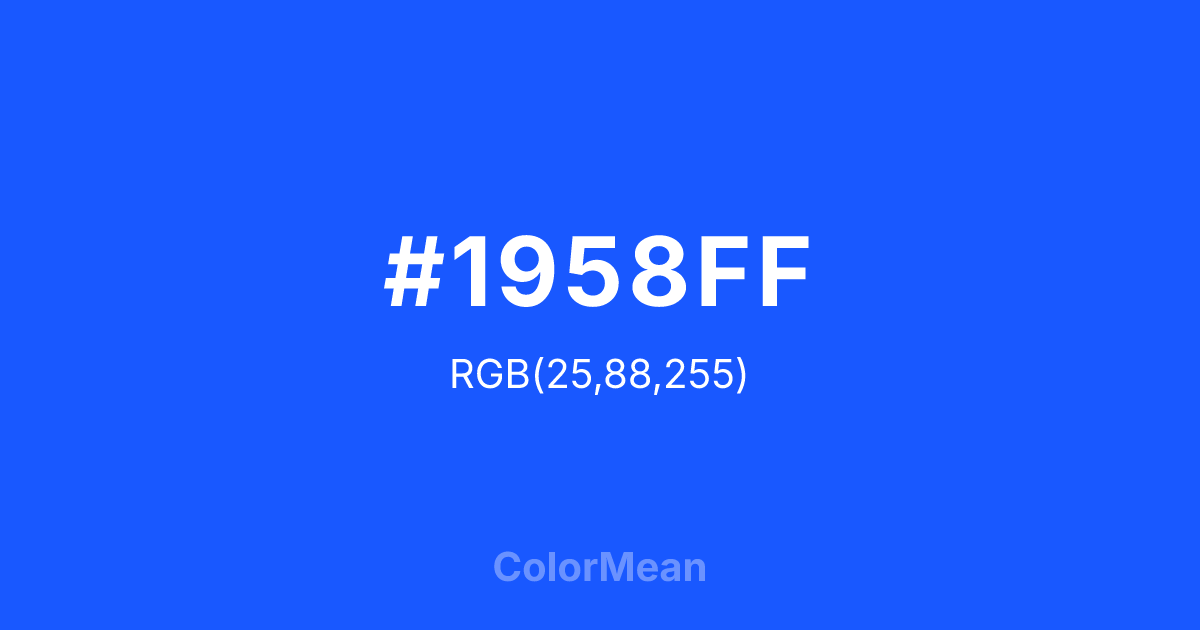 #1958FF RGB value is (25, 88, 255). The hex color red value is 25, green is 88, and blue is 255. Its HSL format shows a hue of 224°, saturation of 100 percent, and lightness of 55 percent. The CMYK process values are 90 percent, 65 percent, 0 percent, 0 percent.