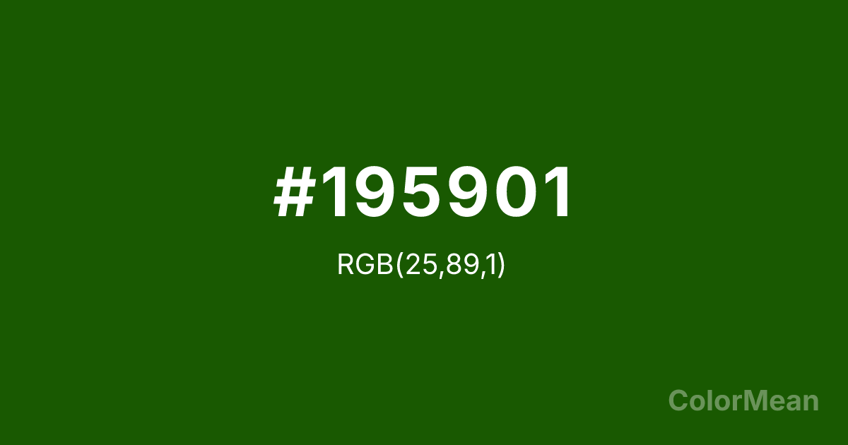 #195901 RGB value is (25, 89, 1). The hex color red value is 25, green is 89, and blue is 1. Its HSL format shows a hue of 104°, saturation of 98 percent, and lightness of 18 percent. The CMYK process values are 72 percent, 0 percent, 99 percent, 65 percent.