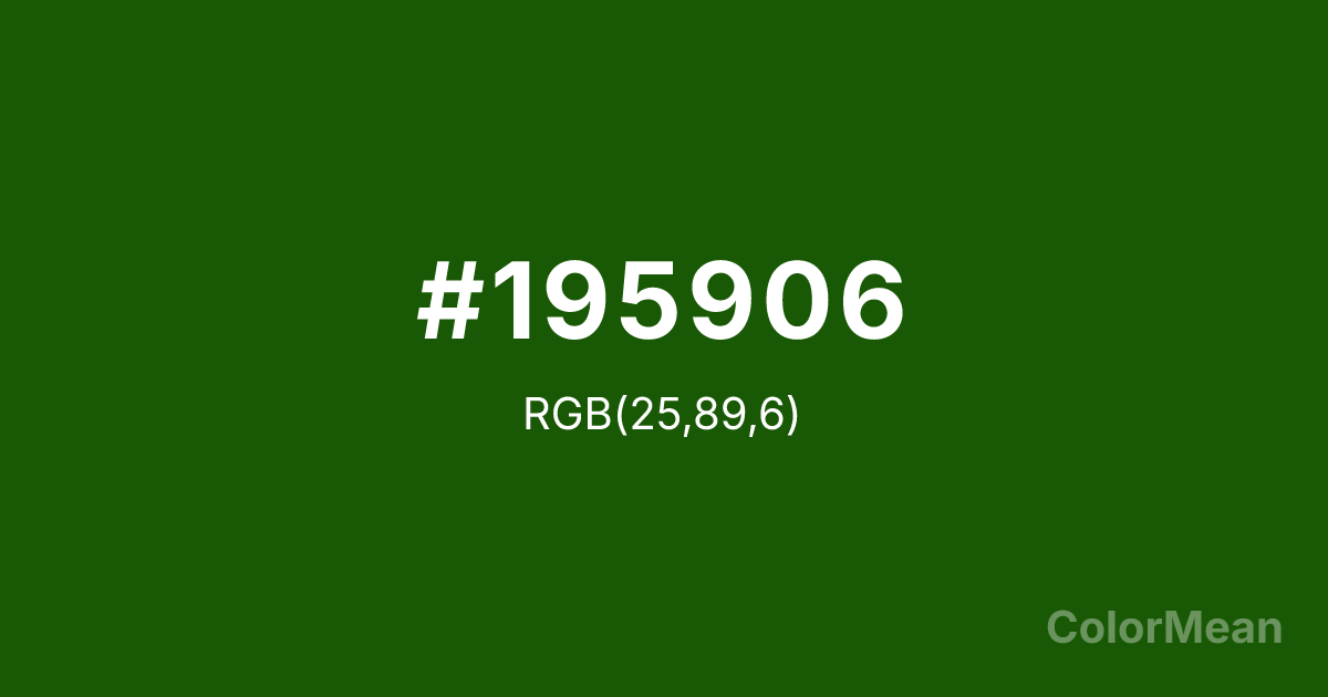 #195906 RGB value is (25, 89, 6). The hex color red value is 25, green is 89, and blue is 6. Its HSL format shows a hue of 106°, saturation of 87 percent, and lightness of 19 percent. The CMYK process values are 72 percent, 0 percent, 93 percent, 65 percent.