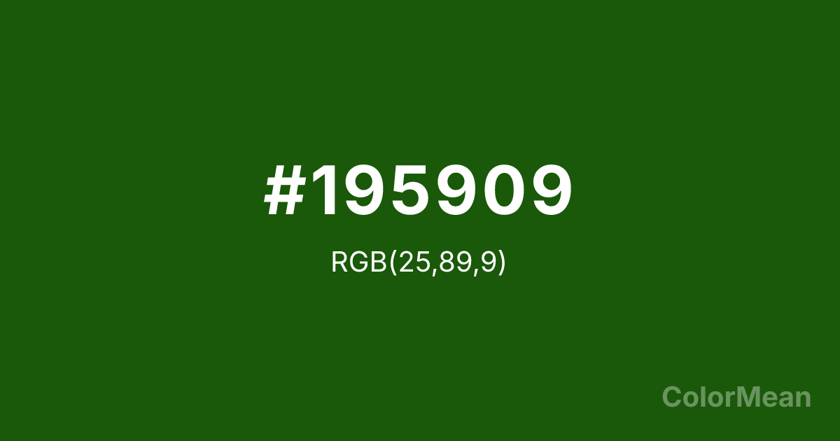 #195909 RGB value is (25, 89, 9). The hex color red value is 25, green is 89, and blue is 9. Its HSL format shows a hue of 108°, saturation of 82 percent, and lightness of 19 percent. The CMYK process values are 72 percent, 0 percent, 90 percent, 65 percent.