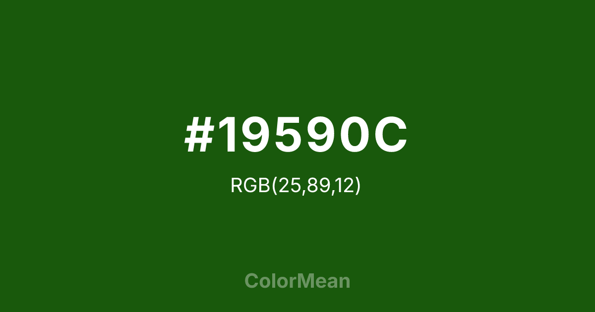 #19590C RGB value is (25, 89, 12). The hex color red value is 25, green is 89, and blue is 12. Its HSL format shows a hue of 110°, saturation of 76 percent, and lightness of 20 percent. The CMYK process values are 72 percent, 0 percent, 87 percent, 65 percent.