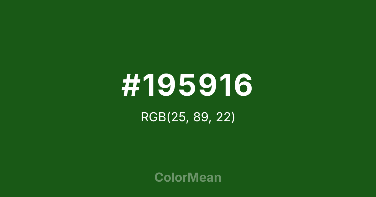 #195916 RGB value is (25, 89, 22). The hex color red value is 25, green is 89, and blue is 22. Its HSL format shows a hue of 117°, saturation of 60 percent, and lightness of 22 percent. The CMYK process values are 72 percent, 0 percent, 75 percent, 65 percent.