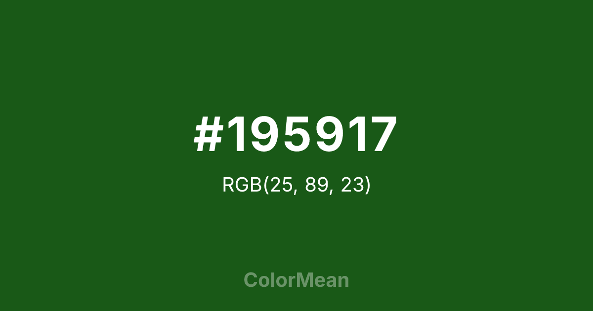 #195917 RGB value is (25, 89, 23). The hex color red value is 25, green is 89, and blue is 23. Its HSL format shows a hue of 118°, saturation of 59 percent, and lightness of 22 percent. The CMYK process values are 72 percent, 0 percent, 74 percent, 65 percent.