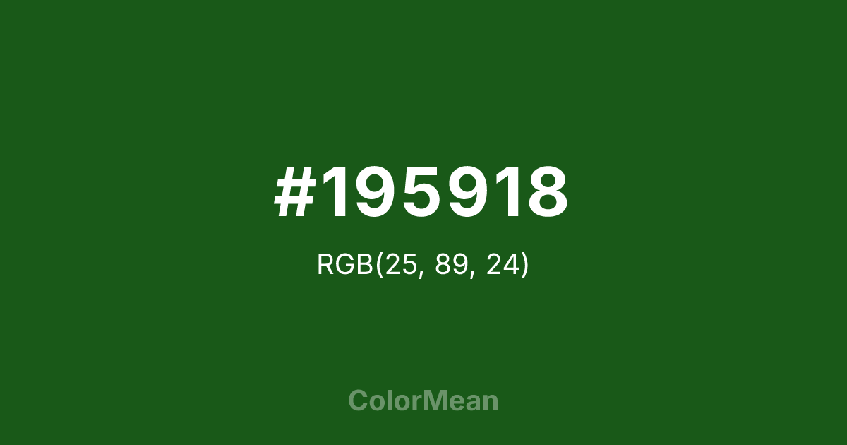 #195918 RGB value is (25, 89, 24). The hex color red value is 25, green is 89, and blue is 24. Its HSL format shows a hue of 119°, saturation of 58 percent, and lightness of 22 percent. The CMYK process values are 72 percent, 0 percent, 73 percent, 65 percent.