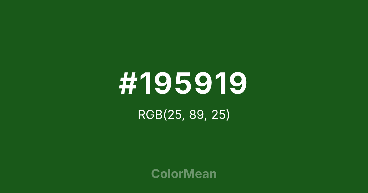 #195919 RGB value is (25, 89, 25). The hex color red value is 25, green is 89, and blue is 25. Its HSL format shows a hue of 120°, saturation of 56 percent, and lightness of 22 percent. The CMYK process values are 72 percent, 0 percent, 72 percent, 65 percent.