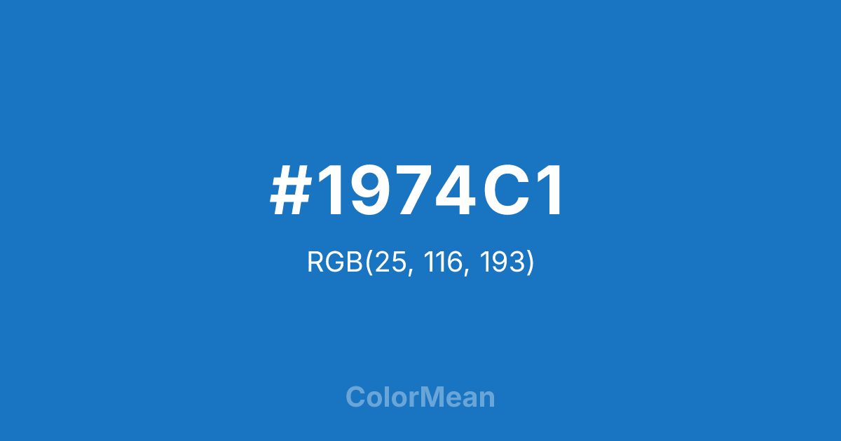 #1974C1 RGB value is (25, 116, 193). The hex color red value is 25, green is 116, and blue is 193. Its HSL format shows a hue of 207°, saturation of 77 percent, and lightness of 43 percent. The CMYK process values are 87 percent, 40 percent, 0 percent, 24 percent.