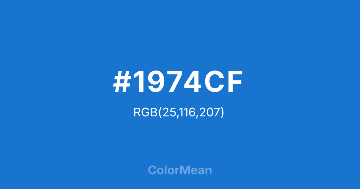 #1974CF RGB value is (25, 116, 207). The hex color red value is 25, green is 116, and blue is 207. Its HSL format shows a hue of 210°, saturation of 78 percent, and lightness of 45 percent. The CMYK process values are 88 percent, 44 percent, 0 percent, 19 percent.