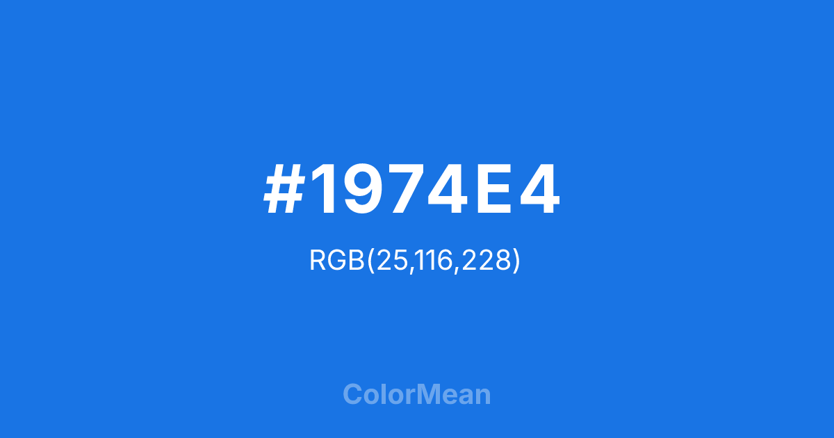 #1974E4 RGB value is (25, 116, 228). The hex color red value is 25, green is 116, and blue is 228. Its HSL format shows a hue of 213°, saturation of 80 percent, and lightness of 50 percent. The CMYK process values are 89 percent, 49 percent, 0 percent, 11 percent.