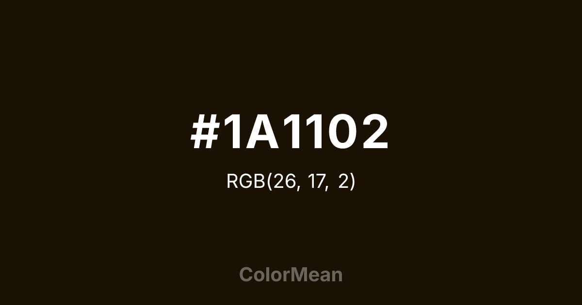 #1A1102 RGB value is (26, 17, 2). The hex color red value is 26, green is 17, and blue is 2. Its HSL format shows a hue of 38°, saturation of 86 percent, and lightness of 5 percent. The CMYK process values are 0 percent, 35 percent, 92 percent, 90 percent.