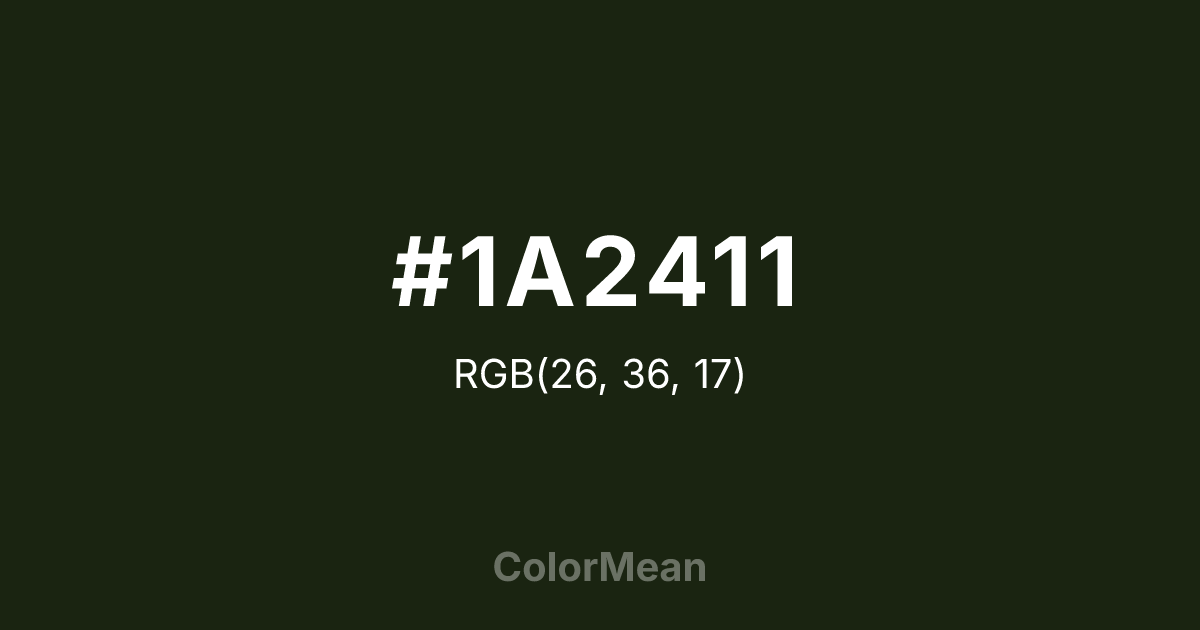 #1A2411 RGB value is (26, 36, 17). The hex color red value is 26, green is 36, and blue is 17. Its HSL format shows a hue of 92°, saturation of 36 percent, and lightness of 10 percent. The CMYK process values are 28 percent, 0 percent, 53 percent, 86 percent.