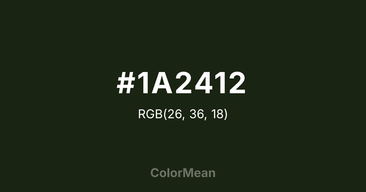 #1A2412 RGB value is (26, 36, 18). The hex color red value is 26, green is 36, and blue is 18. Its HSL format shows a hue of 93°, saturation of 33 percent, and lightness of 11 percent. The CMYK process values are 28 percent, 0 percent, 50 percent, 86 percent.