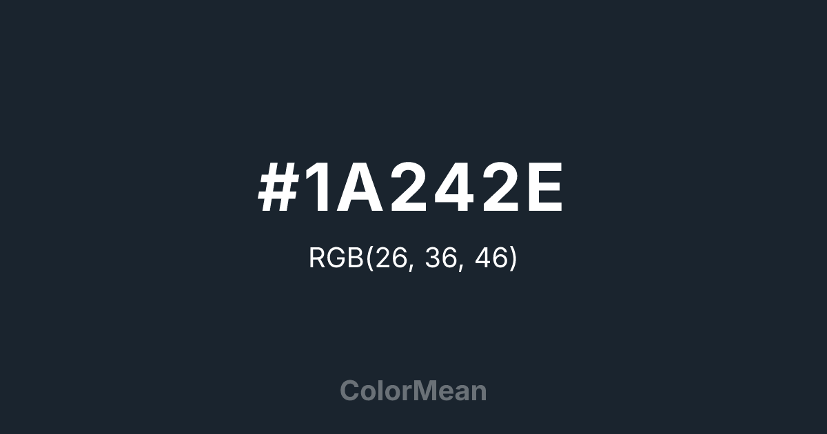 #1A242E RGB value is (26, 36, 46). The hex color red value is 26, green is 36, and blue is 46. Its HSL format shows a hue of 210°, saturation of 28 percent, and lightness of 14 percent. The CMYK process values are 43 percent, 22 percent, 0 percent, 82 percent.