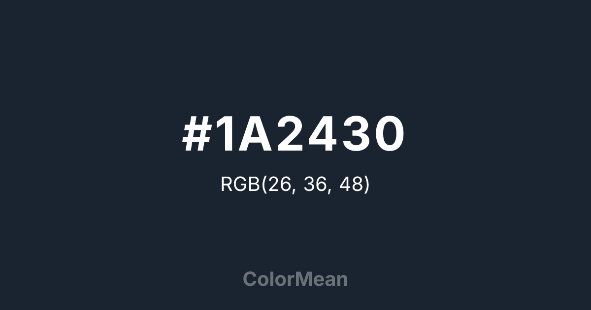 #1A2430 RGB value is (26, 36, 48). The hex color red value is 26, green is 36, and blue is 48. Its HSL format shows a hue of 213°, saturation of 30 percent, and lightness of 15 percent. The CMYK process values are 46 percent, 25 percent, 0 percent, 81 percent.