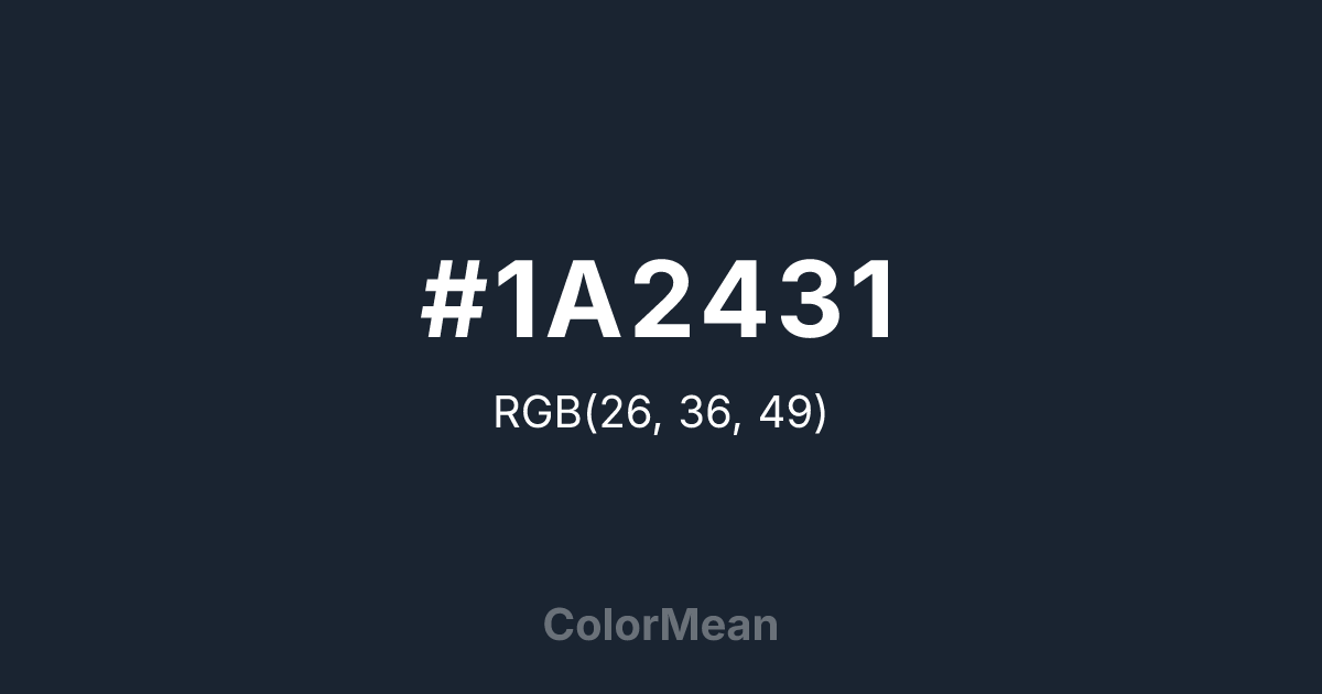 #1A2431 RGB value is (26, 36, 49). The hex color red value is 26, green is 36, and blue is 49. Its HSL format shows a hue of 214°, saturation of 31 percent, and lightness of 15 percent. The CMYK process values are 47 percent, 27 percent, 0 percent, 81 percent.