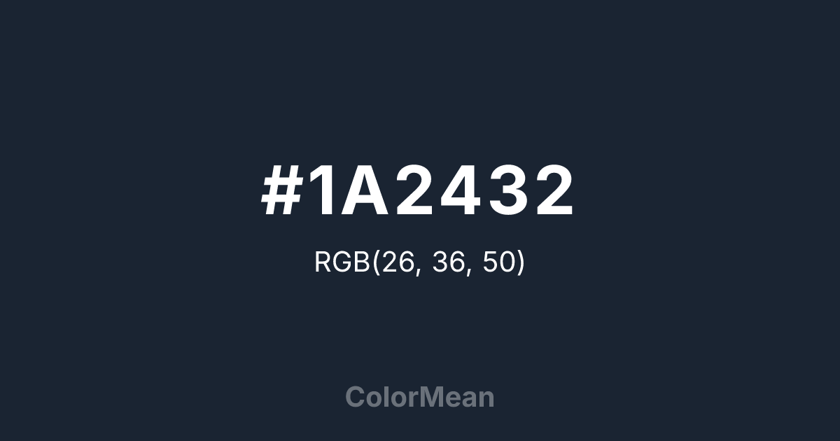 #1A2432 RGB value is (26, 36, 50). The hex color red value is 26, green is 36, and blue is 50. Its HSL format shows a hue of 215°, saturation of 32 percent, and lightness of 15 percent. The CMYK process values are 48 percent, 28 percent, 0 percent, 80 percent.