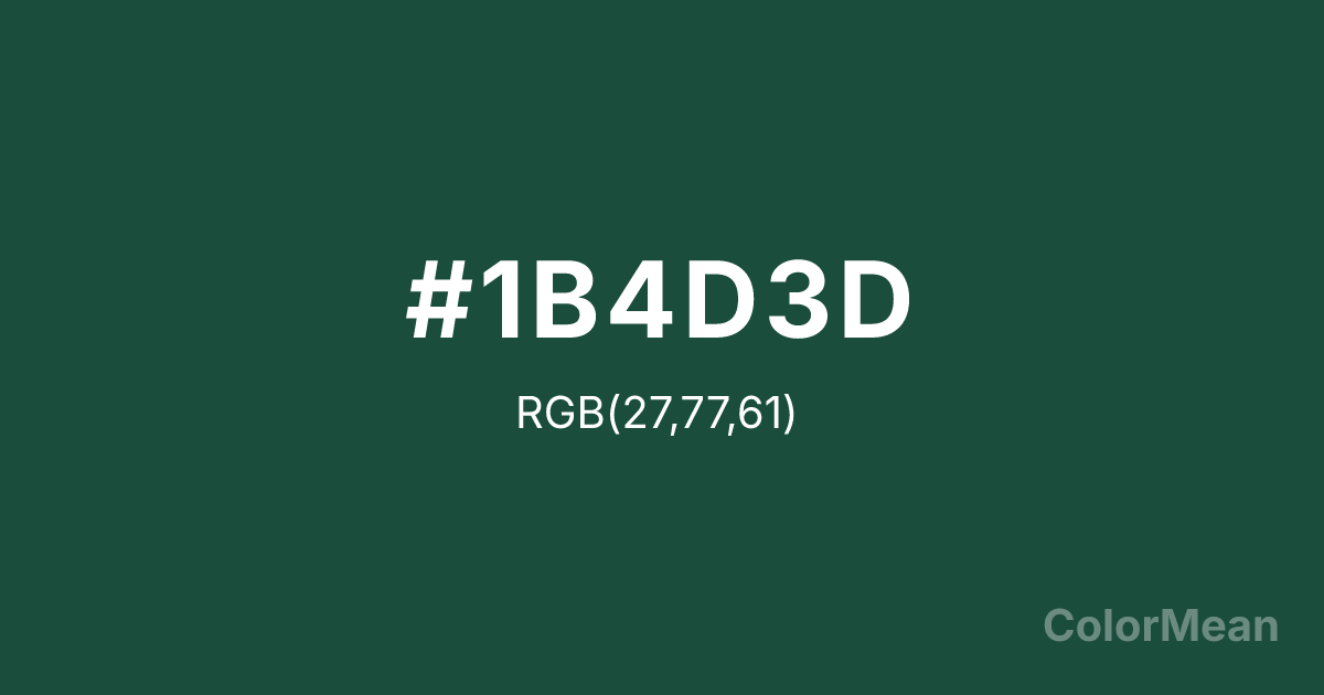 #1B4D3D RGB value is (27, 77, 61). The hex color red value is 27, green is 77, and blue is 61. Its HSL format shows a hue of 161°, saturation of 48 percent, and lightness of 20 percent. The CMYK process values are 65 percent, 0 percent, 21 percent, 70 percent.