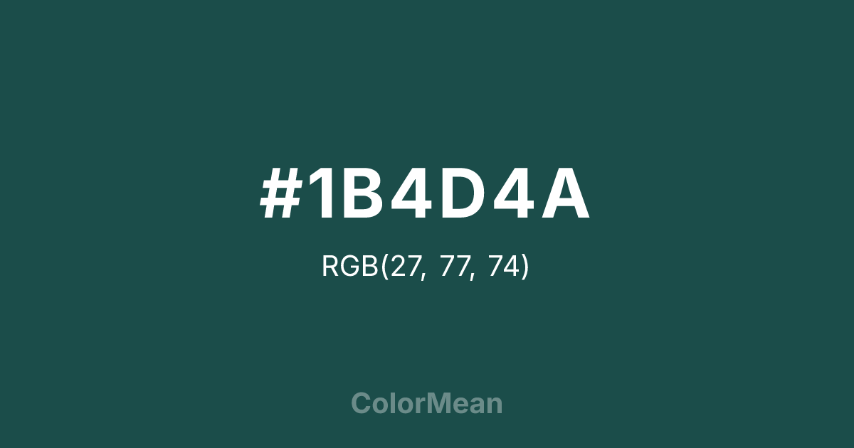 #1B4D4A RGB value is (27, 77, 74). The hex color red value is 27, green is 77, and blue is 74. Its HSL format shows a hue of 176°, saturation of 48 percent, and lightness of 20 percent. The CMYK process values are 65 percent, 0 percent, 4 percent, 70 percent.