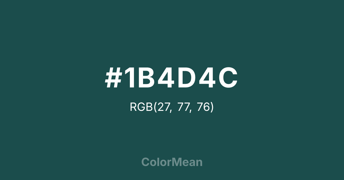 #1B4D4C RGB value is (27, 77, 76). The hex color red value is 27, green is 77, and blue is 76. Its HSL format shows a hue of 179°, saturation of 48 percent, and lightness of 20 percent. The CMYK process values are 65 percent, 0 percent, 1 percent, 70 percent.