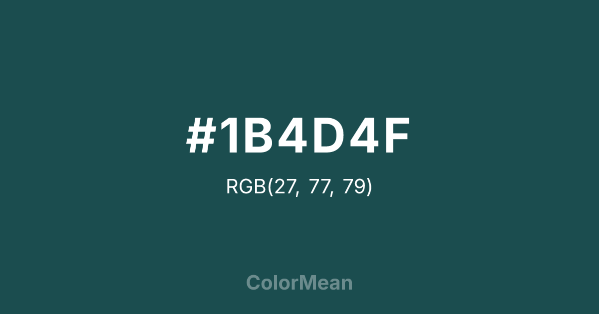 #1B4D4F RGB value is (27, 77, 79). The hex color red value is 27, green is 77, and blue is 79. Its HSL format shows a hue of 182°, saturation of 49 percent, and lightness of 21 percent. The CMYK process values are 66 percent, 3 percent, 0 percent, 69 percent.
