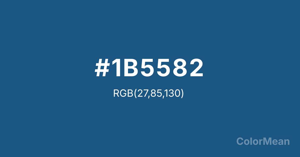 #1B5582 RGB value is (27, 85, 130). The hex color red value is 27, green is 85, and blue is 130. Its HSL format shows a hue of 206°, saturation of 66 percent, and lightness of 31 percent. The CMYK process values are 79 percent, 35 percent, 0 percent, 49 percent.