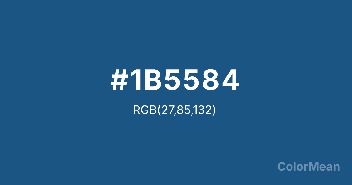 #1B5584 RGB value is (27, 85, 132). The hex color red value is 27, green is 85, and blue is 132. Its HSL format shows a hue of 207°, saturation of 66 percent, and lightness of 31 percent. The CMYK process values are 80 percent, 36 percent, 0 percent, 48 percent.