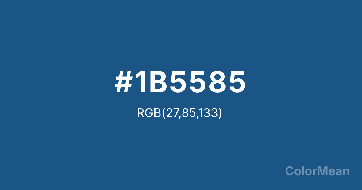 #1B5585 RGB value is (27, 85, 133). The hex color red value is 27, green is 85, and blue is 133. Its HSL format shows a hue of 207°, saturation of 66 percent, and lightness of 31 percent. The CMYK process values are 80 percent, 36 percent, 0 percent, 48 percent.