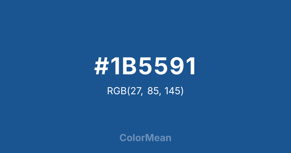#1B5591 RGB value is (27, 85, 145). The hex color red value is 27, green is 85, and blue is 145. Its HSL format shows a hue of 211°, saturation of 69 percent, and lightness of 34 percent. The CMYK process values are 81 percent, 41 percent, 0 percent, 43 percent.