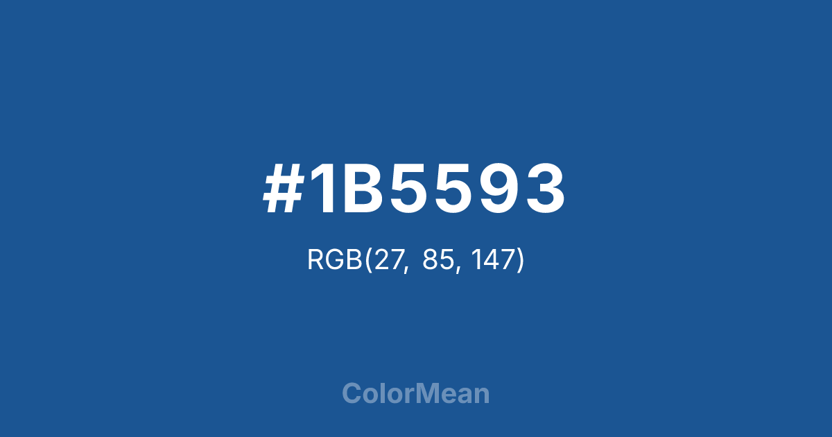 #1B5593 RGB value is (27, 85, 147). The hex color red value is 27, green is 85, and blue is 147. Its HSL format shows a hue of 211°, saturation of 69 percent, and lightness of 34 percent. The CMYK process values are 82 percent, 42 percent, 0 percent, 42 percent.