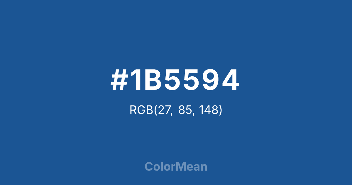 #1B5594 RGB value is (27, 85, 148). The hex color red value is 27, green is 85, and blue is 148. Its HSL format shows a hue of 211°, saturation of 69 percent, and lightness of 34 percent. The CMYK process values are 82 percent, 43 percent, 0 percent, 42 percent.