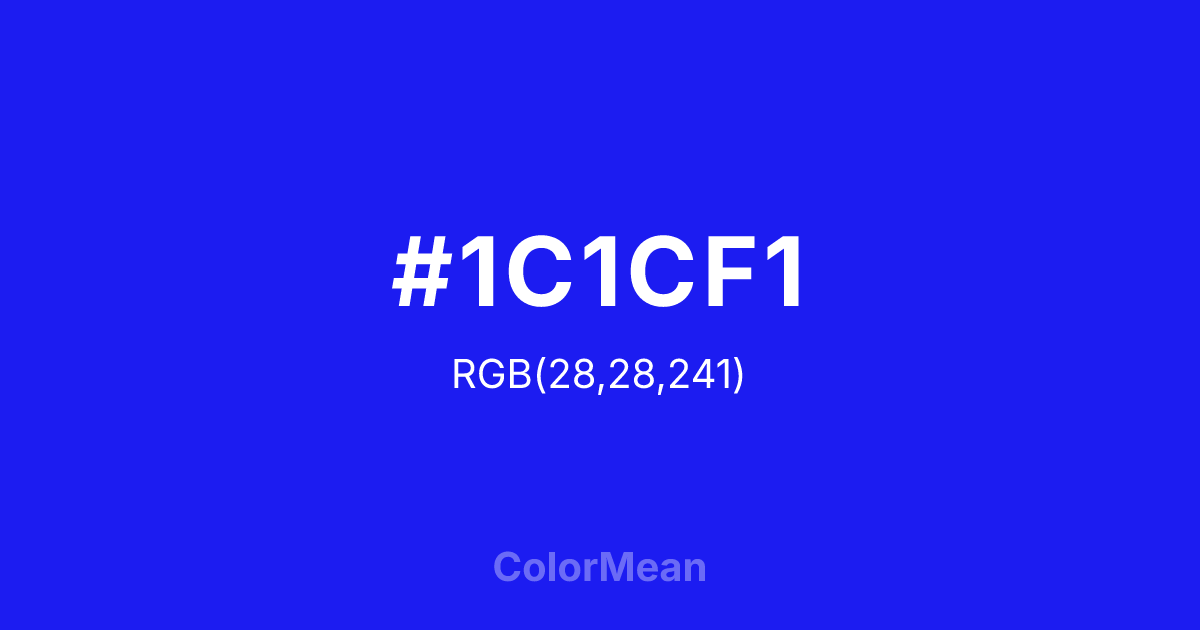 #1C1CF1 RGB value is (28, 28, 241). The hex color red value is 28, green is 28, and blue is 241. Its HSL format shows a hue of 240°, saturation of 88 percent, and lightness of 53 percent. The CMYK process values are 88 percent, 88 percent, 0 percent, 5 percent.
