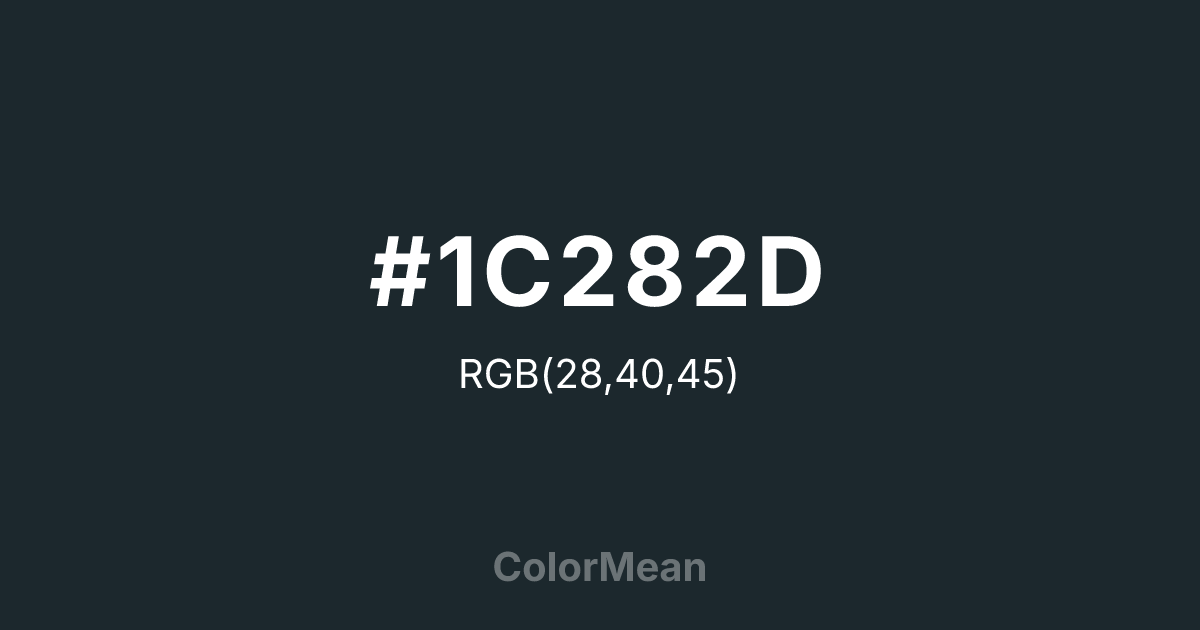 #1C282D RGB value is (28, 40, 45). The hex color red value is 28, green is 40, and blue is 45. Its HSL format shows a hue of 198°, saturation of 23 percent, and lightness of 14 percent. The CMYK process values are 38 percent, 11 percent, 0 percent, 82 percent.