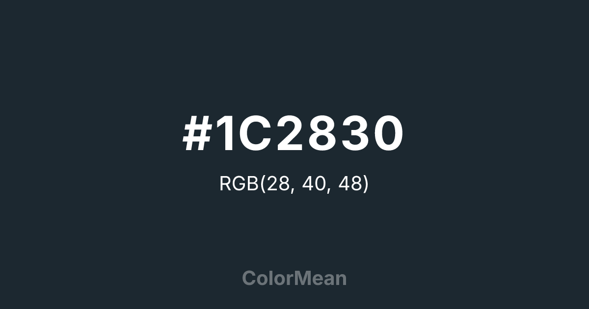 #1C2830 RGB value is (28, 40, 48). The hex color red value is 28, green is 40, and blue is 48. Its HSL format shows a hue of 204°, saturation of 26 percent, and lightness of 15 percent. The CMYK process values are 42 percent, 17 percent, 0 percent, 81 percent.