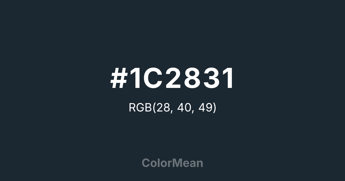 #1C2831 RGB value is (28, 40, 49). The hex color red value is 28, green is 40, and blue is 49. Its HSL format shows a hue of 206°, saturation of 27 percent, and lightness of 15 percent. The CMYK process values are 43 percent, 18 percent, 0 percent, 81 percent.