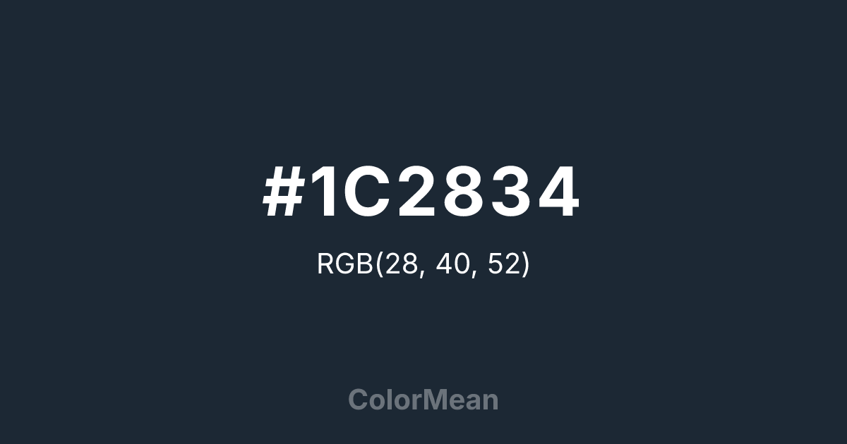 #1C2834 RGB value is (28, 40, 52). The hex color red value is 28, green is 40, and blue is 52. Its HSL format shows a hue of 210°, saturation of 30 percent, and lightness of 16 percent. The CMYK process values are 46 percent, 23 percent, 0 percent, 80 percent.