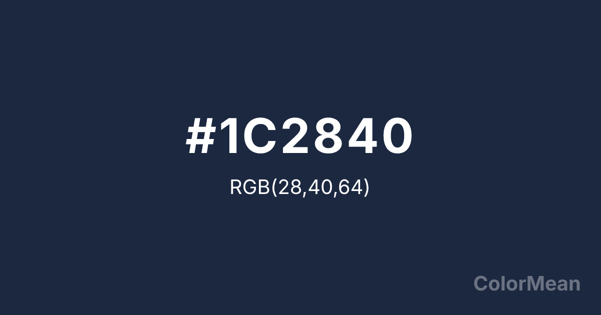 #1C2840 RGB value is (28, 40, 64). The hex color red value is 28, green is 40, and blue is 64. Its HSL format shows a hue of 220°, saturation of 39 percent, and lightness of 18 percent. The CMYK process values are 56 percent, 38 percent, 0 percent, 75 percent.