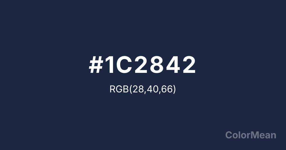 #1C2842 RGB value is (28, 40, 66). The hex color red value is 28, green is 40, and blue is 66. Its HSL format shows a hue of 221°, saturation of 40 percent, and lightness of 18 percent. The CMYK process values are 58 percent, 39 percent, 0 percent, 74 percent.