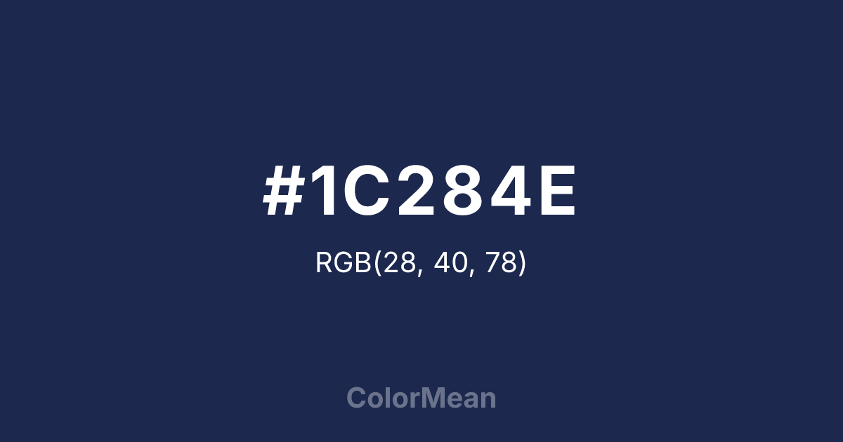 #1C284E RGB value is (28, 40, 78). The hex color red value is 28, green is 40, and blue is 78. Its HSL format shows a hue of 226°, saturation of 47 percent, and lightness of 21 percent. The CMYK process values are 64 percent, 49 percent, 0 percent, 69 percent.